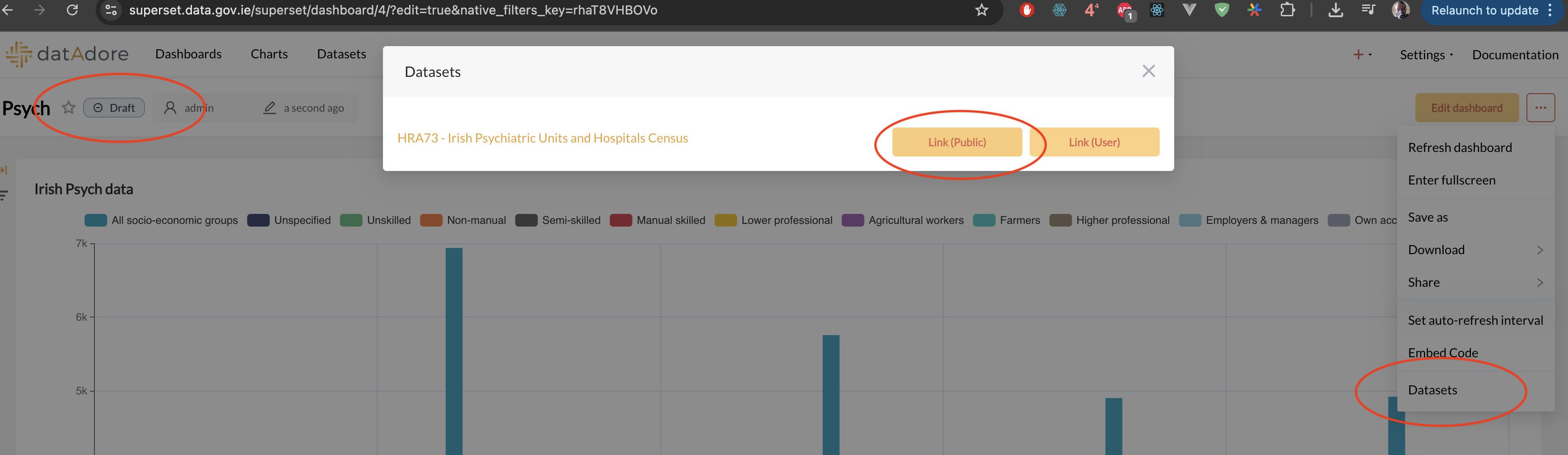 Link the Dashboard to the Dataset either Public (to appear on the dataset for everyone) or User (only for you). Set the Dashboard to “Published”.